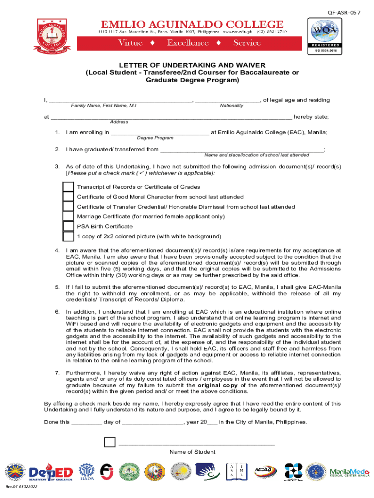 QFASR057LETTER OF UNDERTAKING AND WAIVER (Local Student Transferee/2nd Courser for Baccalaureate or Graduate Degree Program) I, ___, ___, of legal age and residing Family Name, First Name, M. Nationality