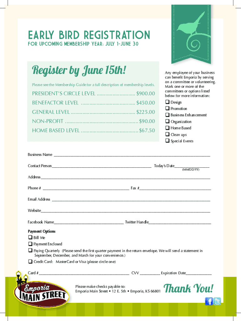 EARLY BIRD REGISTRATION FOR UPCOMING MEMBERSHIP YEAR: JULY 1JUNE 30Register by June 15th! Please see the Membership Guide for a full description of membership levels. PRESIDENTS CIRCLE LEVEL............................