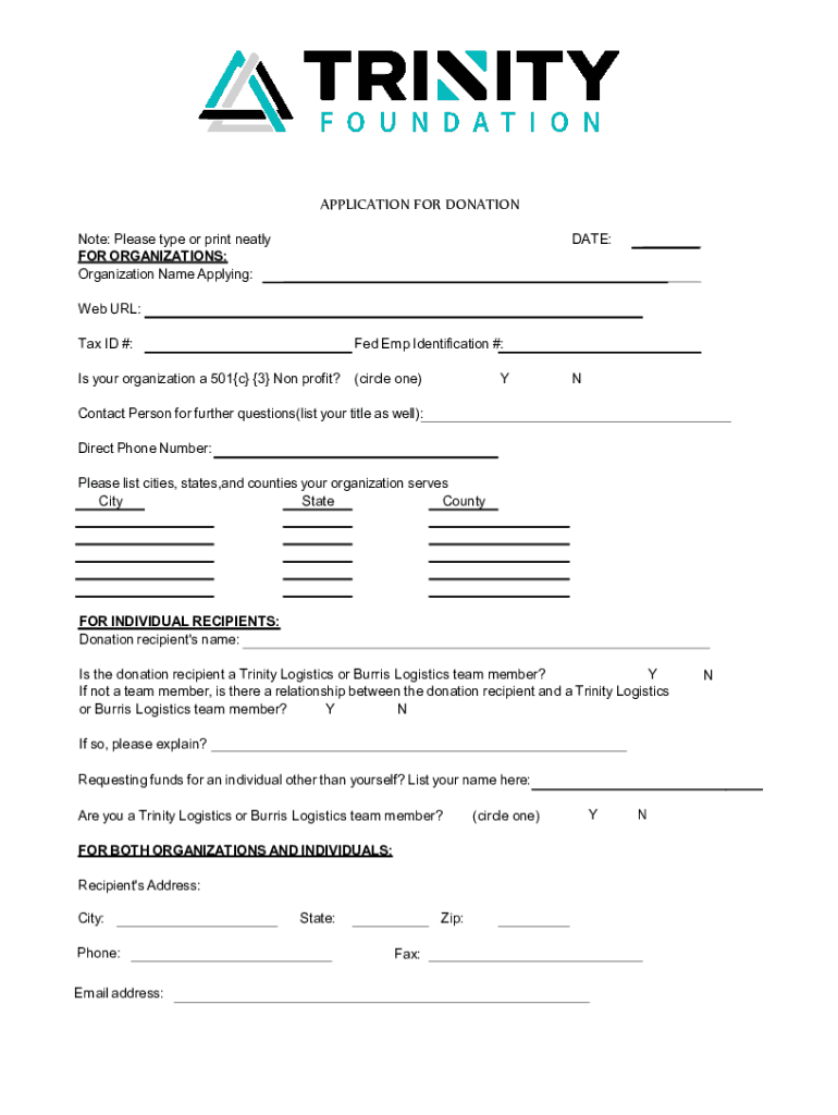 APPLICATION FOR DONATION Note: Please type or print neatly FOR ORGANIZATIONS: Organization Name Applying:DATE:Web URL: Tax ID #:Fed EMP Identification #:Is your organization a 501c 3 Non profit?(circle