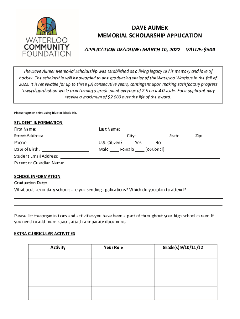 DAVE AUGER MEMORIAL SCHOLARSHIP APPLICATION DEADLINE: MARCH 10, 2022, VALUE: $500The Dave Auger Memorial Scholarship was established as a living legacy to his memory and love of hockey. The scholarship