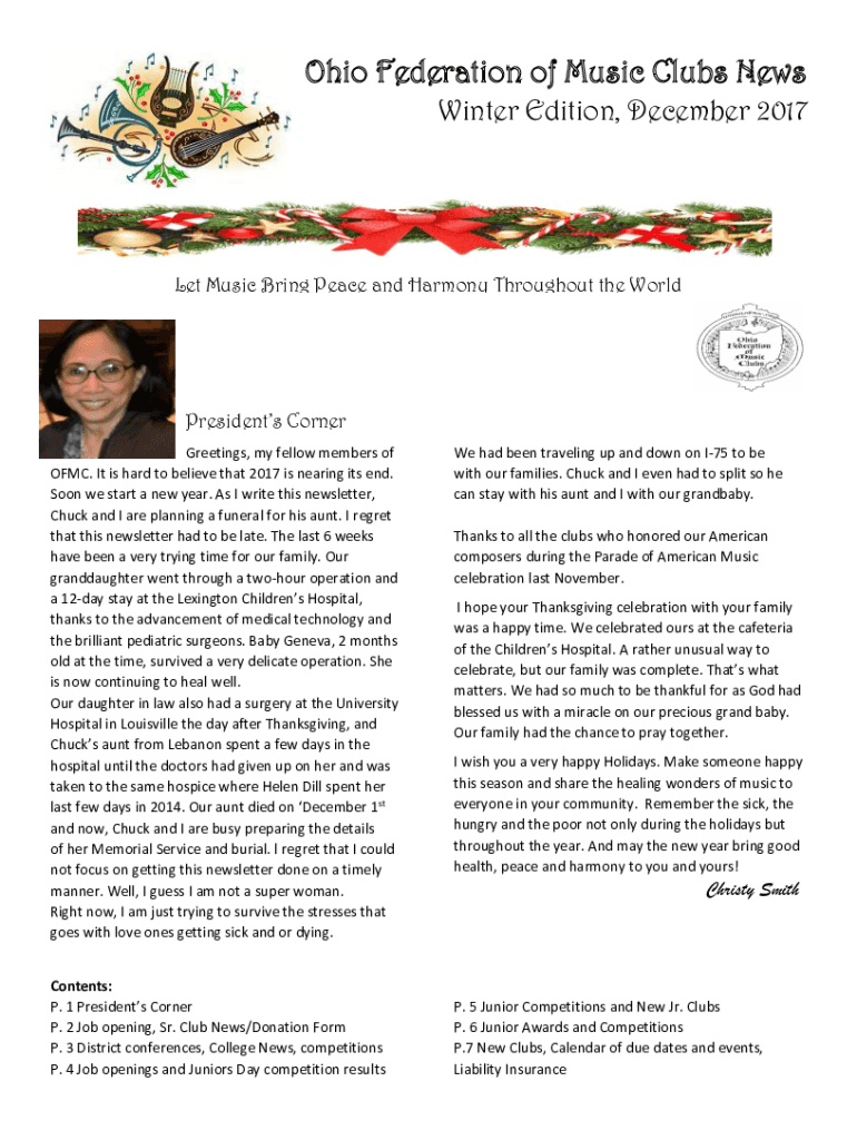 Ohio Federation of Music Clubs News Winter Edition, December 2017Let Music Bring Peace and Harmony Throughout the WorldPresidents Corner Greetings, my fellow members of FMC. It is hard to believe