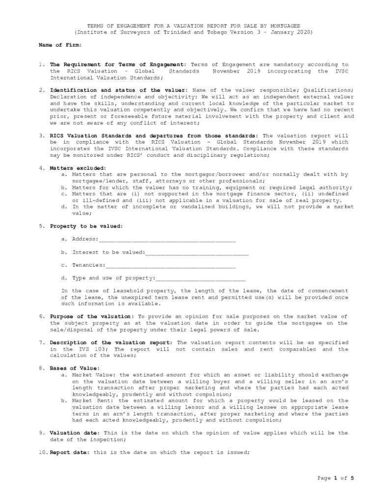 TERMS OF ENGAGEMENT FOR A VALUATION REPORT FOR SALE BY MORTGAGEE (Institute of Surveyors of Trinidad and Tobago Version 3 January 2020) Name of Firm: 1. The Requirement for Terms of Engagement: Terms