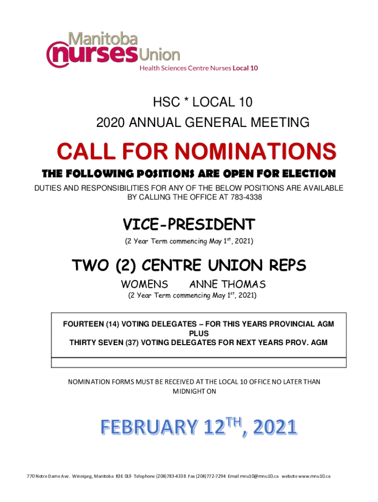HSC * LOCAL 10 2020 ANNUAL GENERAL MEETINGCALL FOR NOMINATIONS THE FOLLOWING POSITIONS ARE OPEN FOR ELECTION DUTIES AND RESPONSIBILITIES FOR ANY OF THE BELOW POSITIONS ARE AVAILABLE BY CALLING THE