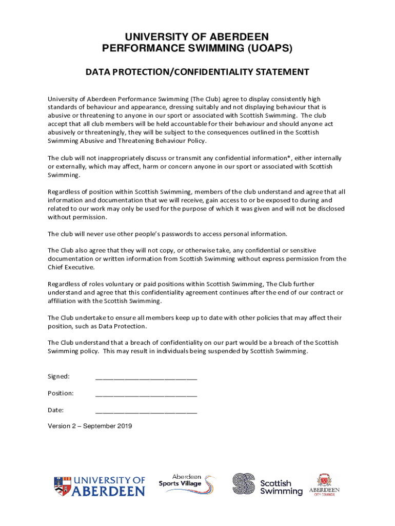 UNIVERSITY OF ABERDEEN PERFORMANCE SWIMMING (SOAPS) DATA PROTECTION/CONFIDENTIALITY STATEMENT University of Aberdeen Performance Swimming (The Club) agree to display consistently high standards of