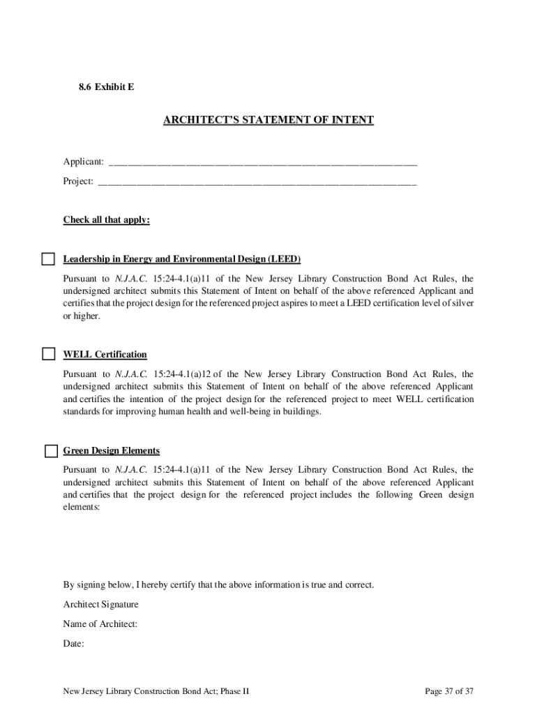 8.6 Exhibit ARCHITECTS STATEMENT OF INTENTApplicant: ___ Project: ___Check all that apply:Leadership in Energy and Environmental Design (LEED) Pursuant to N.J.A.C. 15:244.1(a)11 of the New Jersey