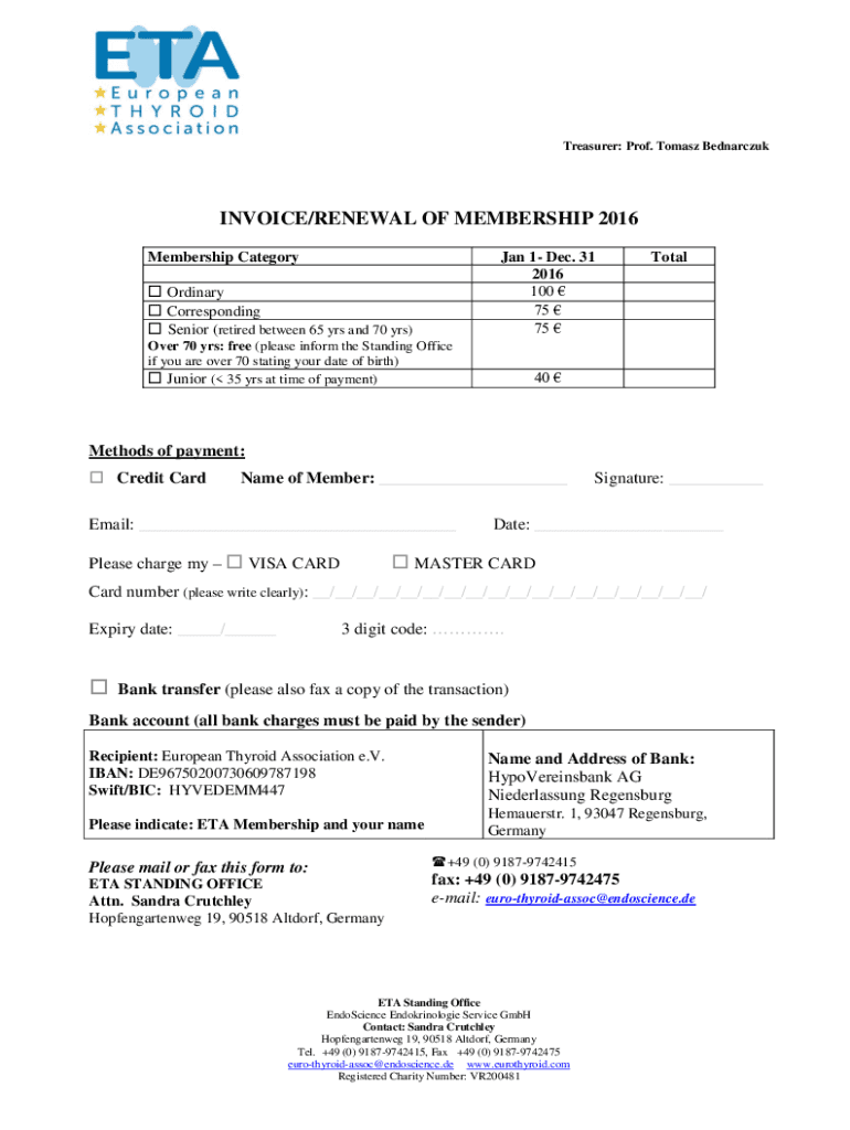 Treasurer: Prof. Tomasz BednarczukINVOICE/RENEWAL OF MEMBERSHIP 2016