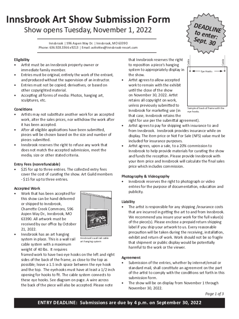 Inns brook Art Show Submission Formed to ENT INE Sept. 3er: 0Show opens Tuesday, November 1, 2022, Inns brook | 596 Aspen Way Dr. | Inns brook, MO 63390 Phone: 636.928.3366 x9213 | Email: activities@innsbrookresort.comConditions
