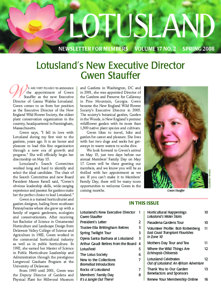 LOWLAND NEWSLETTER FOR MEMBERSVOLUME 17 NO. 2SPRING 2008Lotuslands New Executive Director Gwen Stauffer and Gardens in Washington, DC and in 2001, she was appointed Director of the Gardens and Preserve