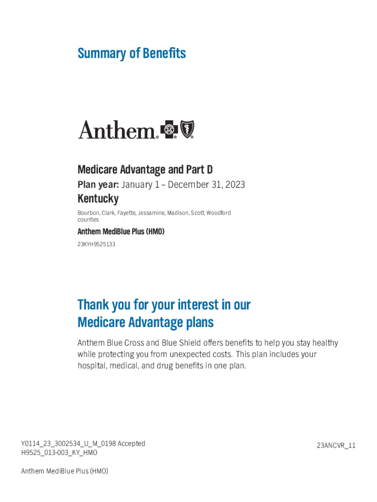 Summary of Benefits Medicare Advantage and Part D Plan year: January 1 December 31, 2023Kentucky Bourbon, Clark, Fayette, Jess amine, Madison, Scott, Woodford countiesAnthem Edible Plus (HMO) 23KYH9525133Thank