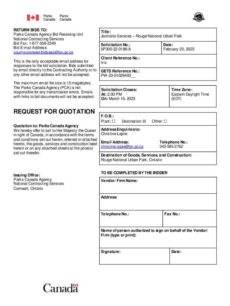 RETURN BIDS TO: Parks Canada Agency Bid Receiving Unit National Contracting Services Bid Fax: 18775582349 Bid Email Address: soumissionsestbidseast@pc.gc.ca This is the only acceptable email address
