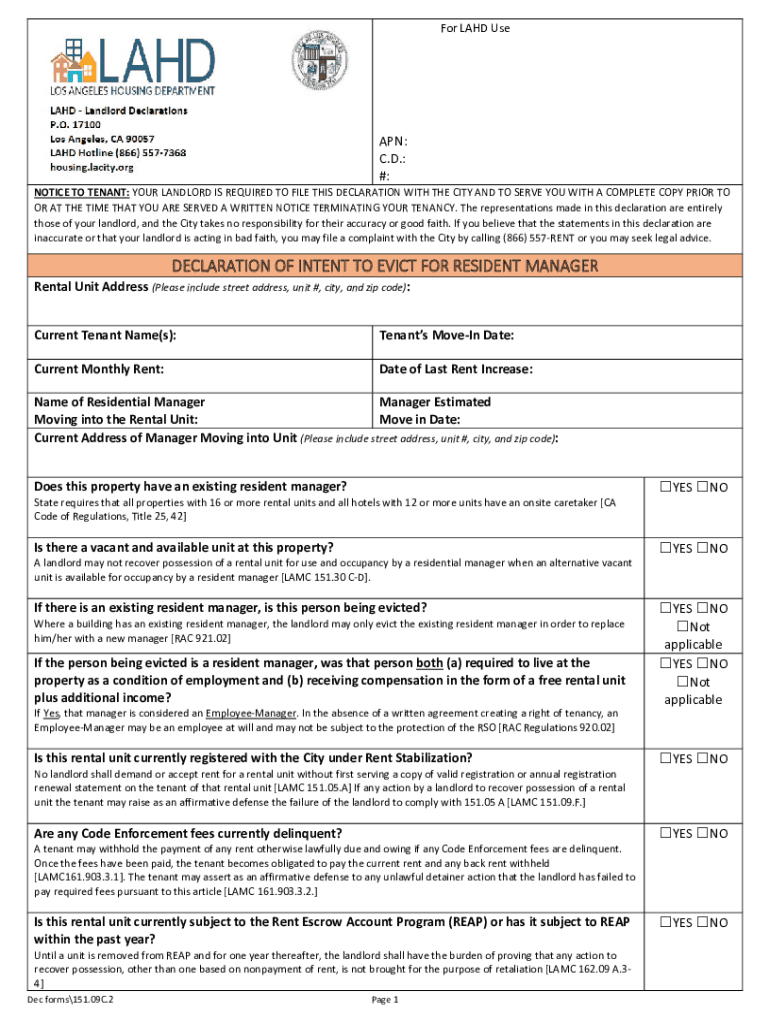 LADLES ANGELES HOUSING DEPARTMENT LAND Landlord Declarations P.O.17100For LAND Use\'Los Angeles, CA 90057 LAND Hotline 866) 5577368 housing. Laity.organ: C.D.: #:NOTICE TO TENANT: YOUR LANDLORD IS