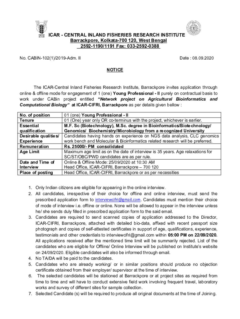 CAR CENTRAL INLAND FISHERIES RESEARCH INSTITUTE Barrack pore, Kolkata700 120, West Bengal 25921190/1191 Fax: 03325920388 No. CABIN102(1)/2019Adm. IDATE : 08.09.2020 Notice Paracentral Inland Fisheries
