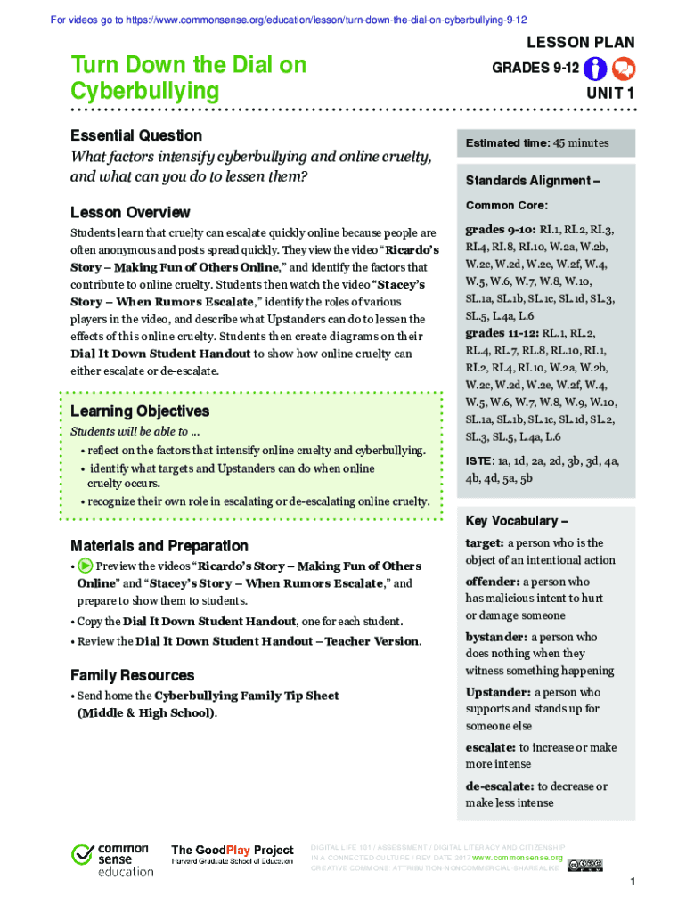 For videos go to https://www.commonsense.org/education/lesson/turndownthedialoncyberbullying912LESSON PLANT urn Down the Dial on CyberbullyingGRADES 912UNIT 1Essential Question What factors intensify