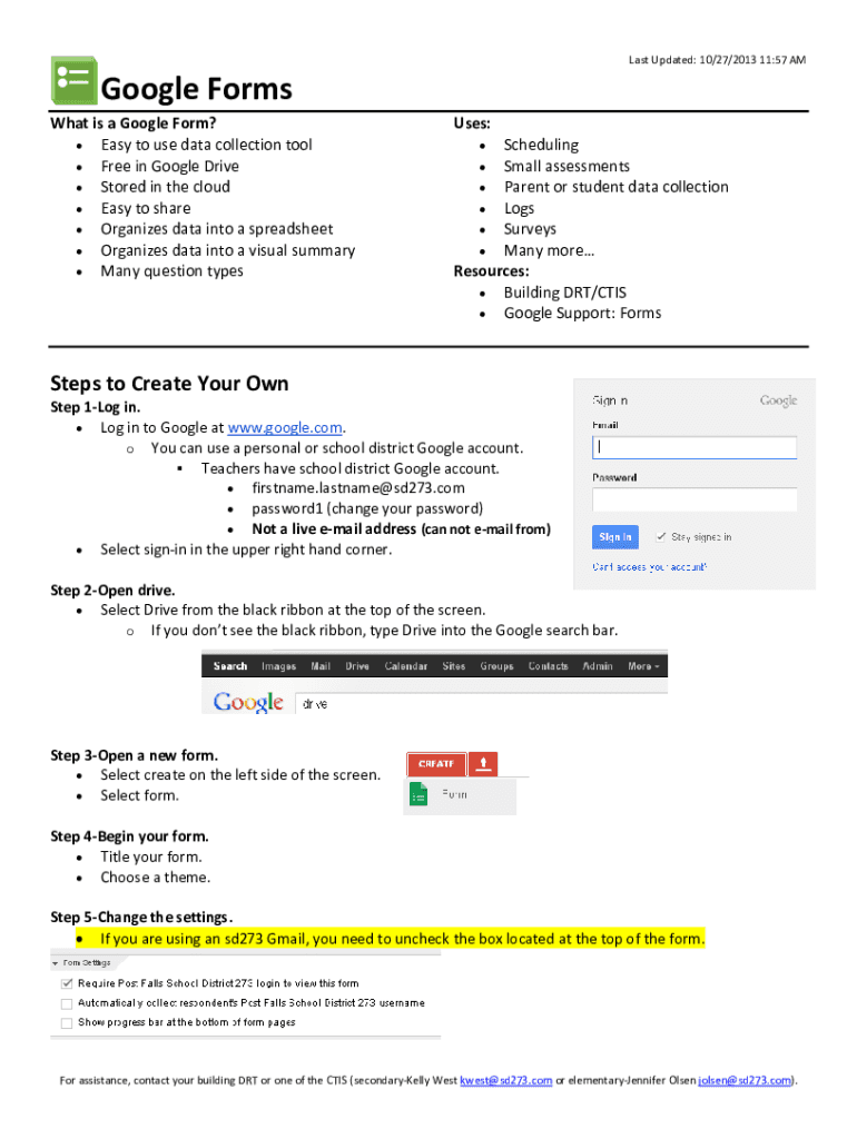 Last Updated: 10/27/2013 11:57 AM Google Forms What is a Google Form? Easy to use data collection tool Free in Google Drive Stored in the cloud Easy to share Organizes data into a spreadsheet Organizes