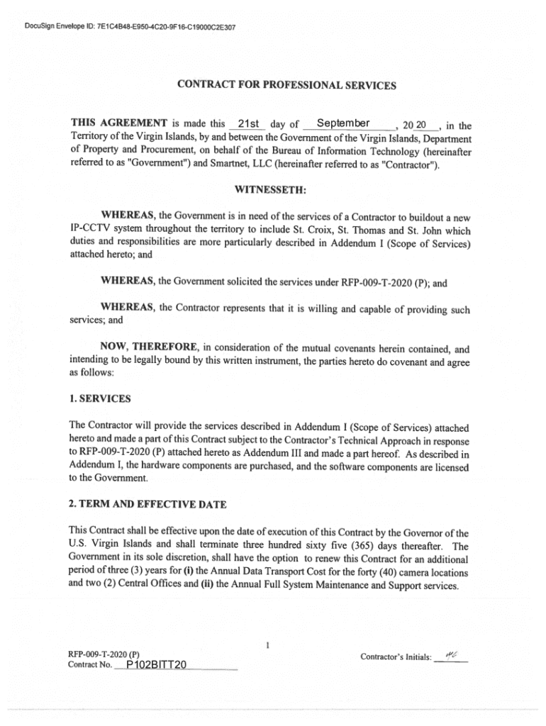 ___ ______, DocuSign Envelope ID: 7E1C4B48E9504C209F16C19000C2E307CONTRACT FOR PROFESSIONAL SERVICES THIS AGREEMENT is made this 21st day of September 20 20 in the Territory of the Virgin Islands,