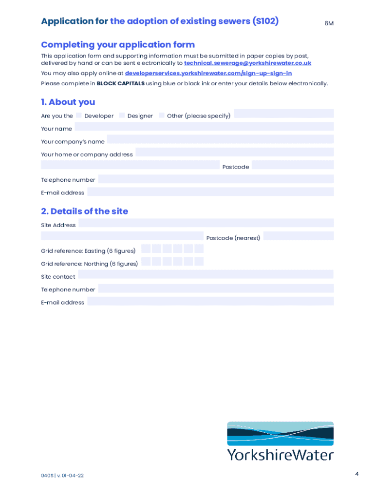 Get the free Application for the adoption of existing sewers - Yorkshire Water