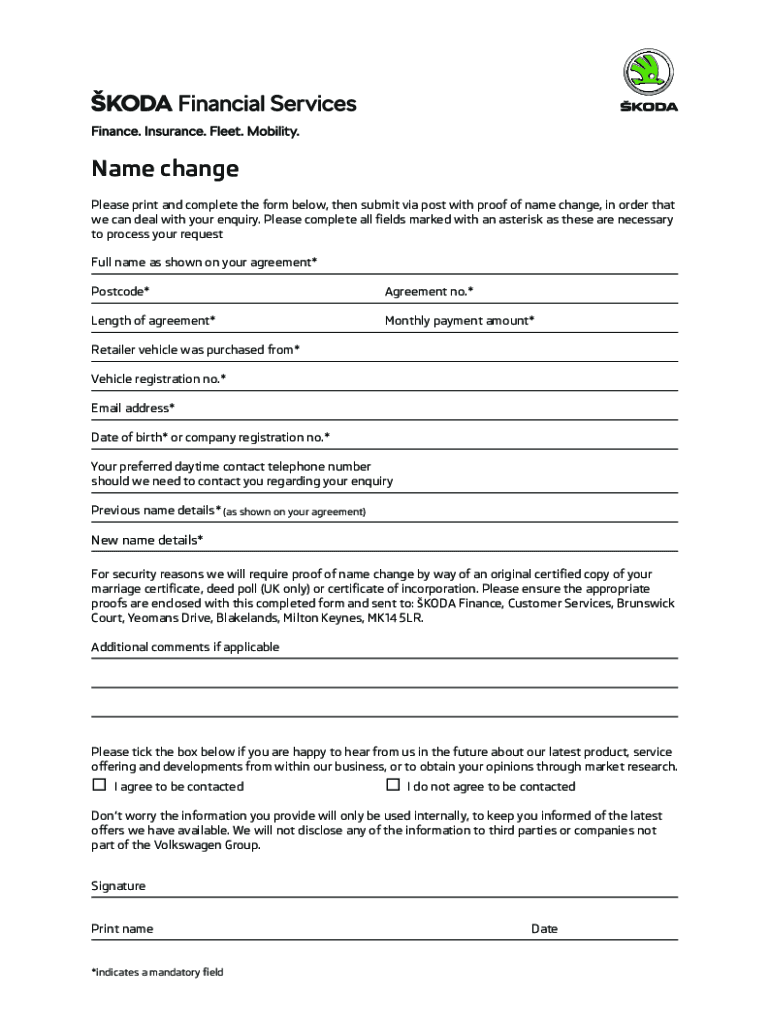 Name change Please print and complete the form below, then submit via post with proof of name change, in order that we can deal with your inquiry. Please complete all ends marked with an asterisk