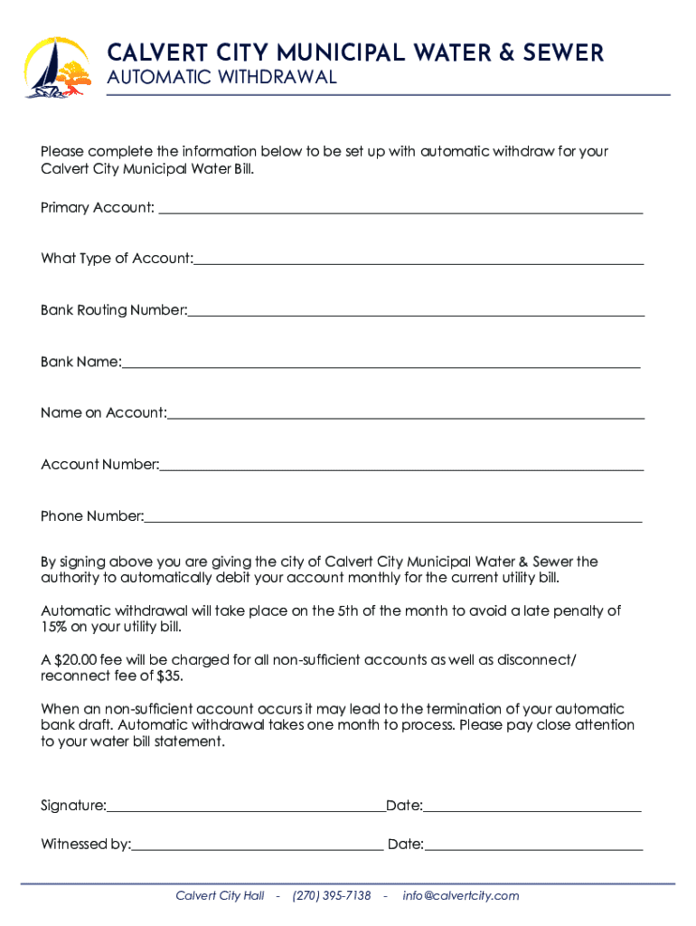 CITY HALL WITHDRAWALCALVERT Displease complete the information below to be set up with automatic withdraw