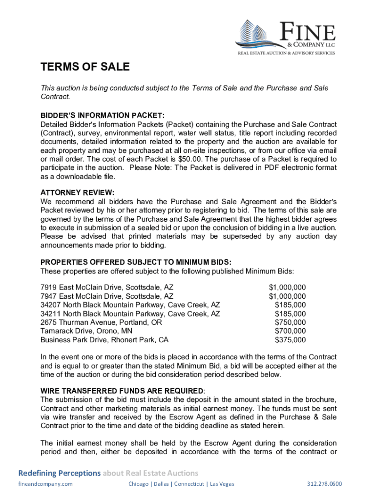 TERMS OF SALE This auction is being conducted subject to the Terms of Sale and the Purchase and Sale Contract. BIDDERS INFORMATION PACKET: Detailed Bidder\'s Information Packets (Packet) containing