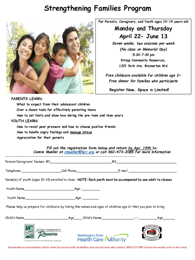 Strengthening Families Program For Parents, Caregivers, and Youth ages 1014 years old Monday and Thursday, April 22 June 13 Seven weeks, two sessions per week (No class on Memorial Day) 5:307:30 pm