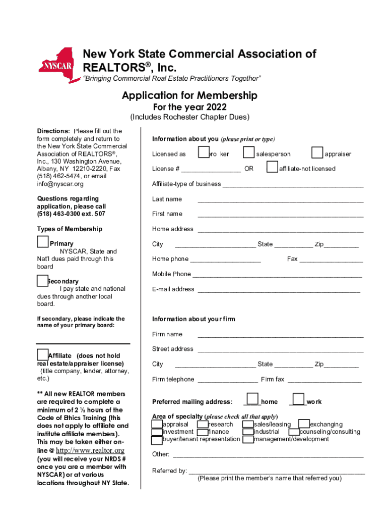 New York State Commercial Association of REALTORS, Inc. Bringing Commercial Real Estate Practitioners TogetherApplication for Membership For the year 2022(Includes Rochester Chapter Dues) Directions: