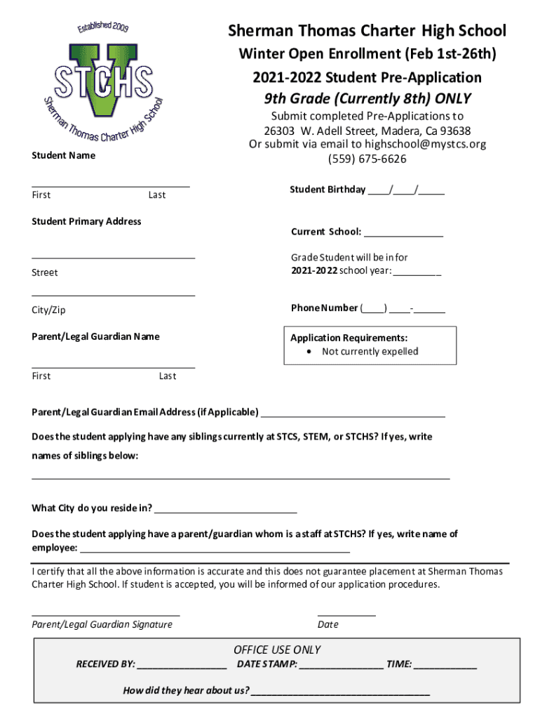 Sherman Thomas Charter High School Winter Open Enrollment (Feb 1st26th) 20212022 Student Reapplication 9th Grade (Currently 8th) ONLY Submit completed Reapplications to 26303 W. Dell Street, Madera,