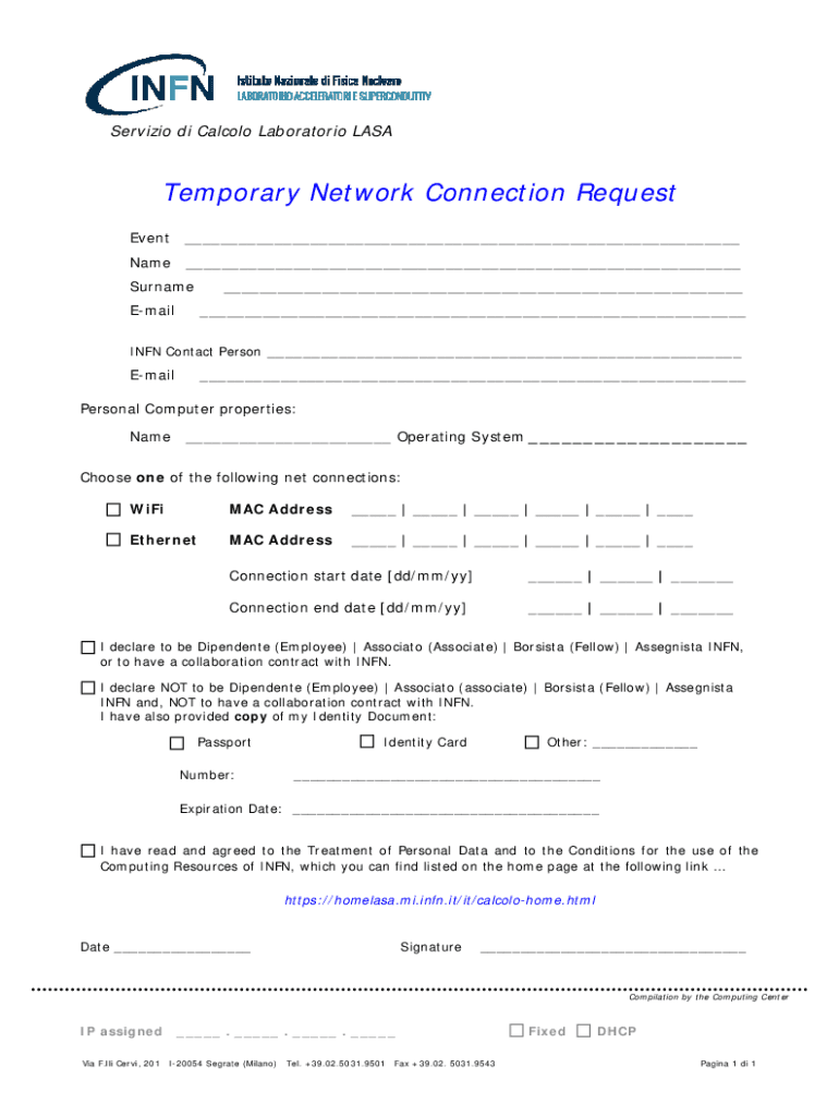 Servillo di Malcolm Lab oratorio LASATemporary Network Connection Request Event___Name___Surname___Email___INN Contact Person ___Email___Personal Computer properties: ___ Operating System ___NameChoose