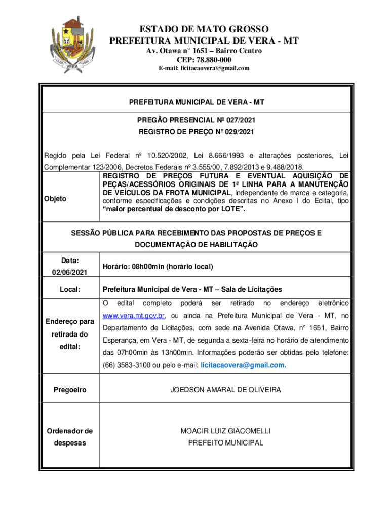 ESTATE DE MATO GROSSO PREFECTURE MUNICIPAL DE VERA MT Av. Ottawa n 1651 Herero CENTR CEP: 78.880000 Email: licitacaovera@gmail.comPREFEITURA MUNICIPAL DE VERA MT PRESO PRESENCE N 027/2021 REGISTRY