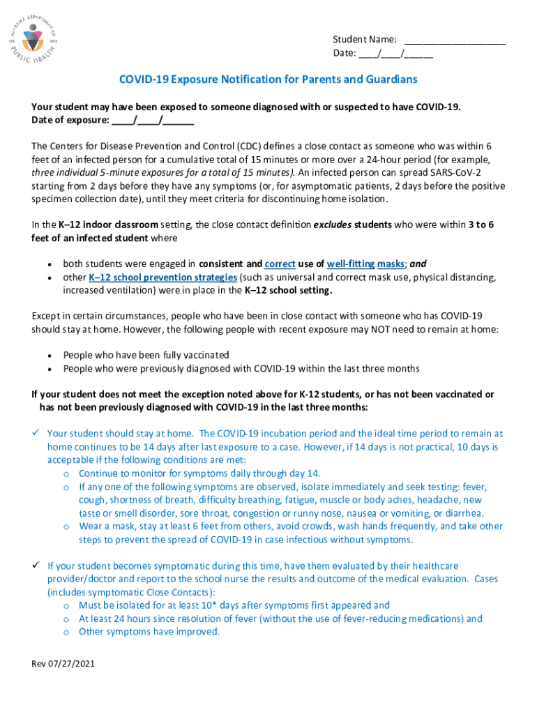 Student Name: ___ Date: ___/___/___COVID-19 Exposure Notification for Parents and Guardians Your student may have been exposed to someone diagnosed with or suspected to have COVID-19. Date of exposure:
