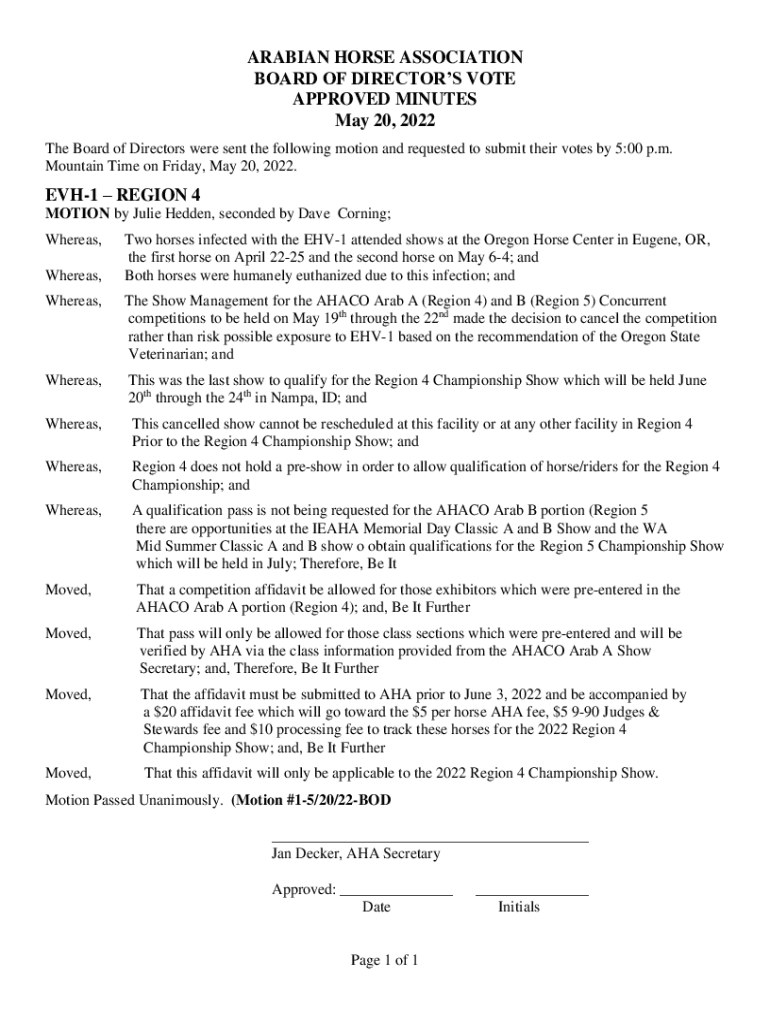 ARABIAN HORSE ASSOCIATION BOARD OF DIRECTORS VOTE APPROVED MINUTES May 20, 2022, The Board of Directors were sent the following motion and requested to submit their votes by 5:00 p.m. Mountain Time