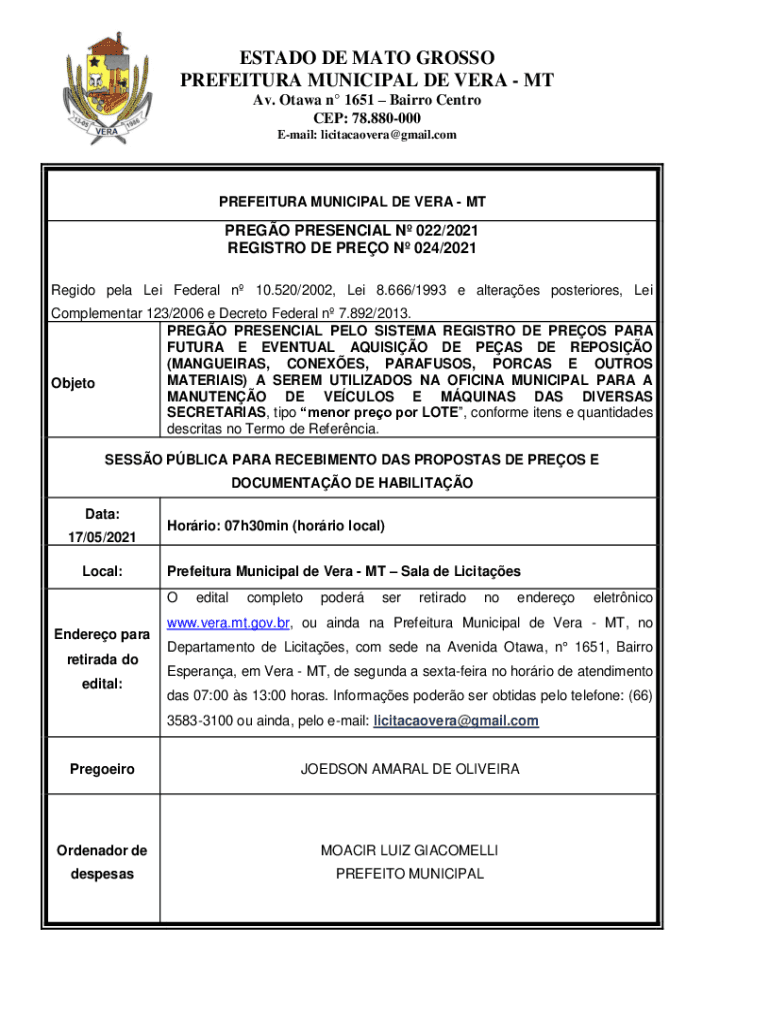 ESTATE DE MATO GROSSO PREFECTURE MUNICIPAL DE VERA MT Av. Ottawa n 1651 Herero CENTR CEP: 78.880000 Email: licitacaovera@gmail.comPREFEITURA MUNICIPAL DE VERA STEREO PRESENCE N 022/2021 REGISTRY DE