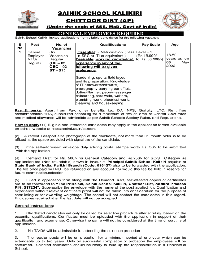 Get the free General Employee (Multi Tasking Staff) Post in Sainik School ...