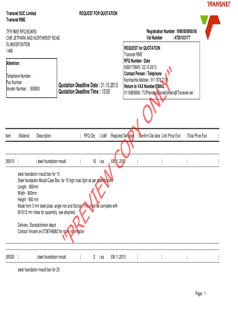 Transnet SOC Limited Transnet REQUEST FOR QUOTATION Registration Number: 1990/000900/06 Vat Number : 4720103177TFR RME RFQ BOARD CNR JETPACK AND NORTHERN ROAD ELANDSFONTEIN 1406 Attention: Telephone