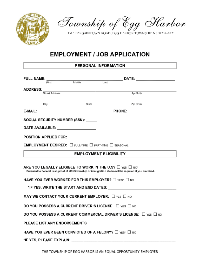 Township of Egg Harbor 3515 MORGANTOWN ROAD, EGG HARBOR TOWNSHIP NJ 082348321EMPLOYMENT / JOB APPLICATION PERSONAL INFORMATION FULL NAME: ___ DATE: ___ FirstMiddleLastADDRESS: ___ Street Address/Suite___