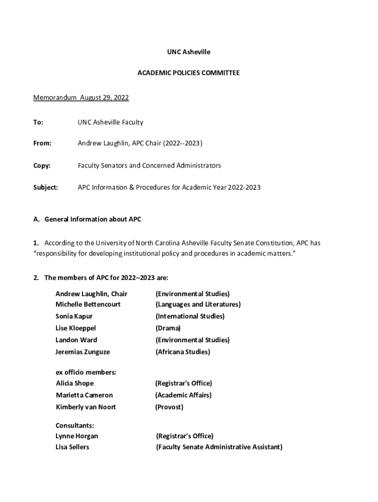 UNC Asheville ACADEMIC POLICIES COMMITTEE Memorandum August 29, 2022, To:UNC Asheville FacultyFrom:Andrew Loughlin, APC Chair (20222023)Copy:Faculty Senators and Concerned AdministratorsSubject:APC