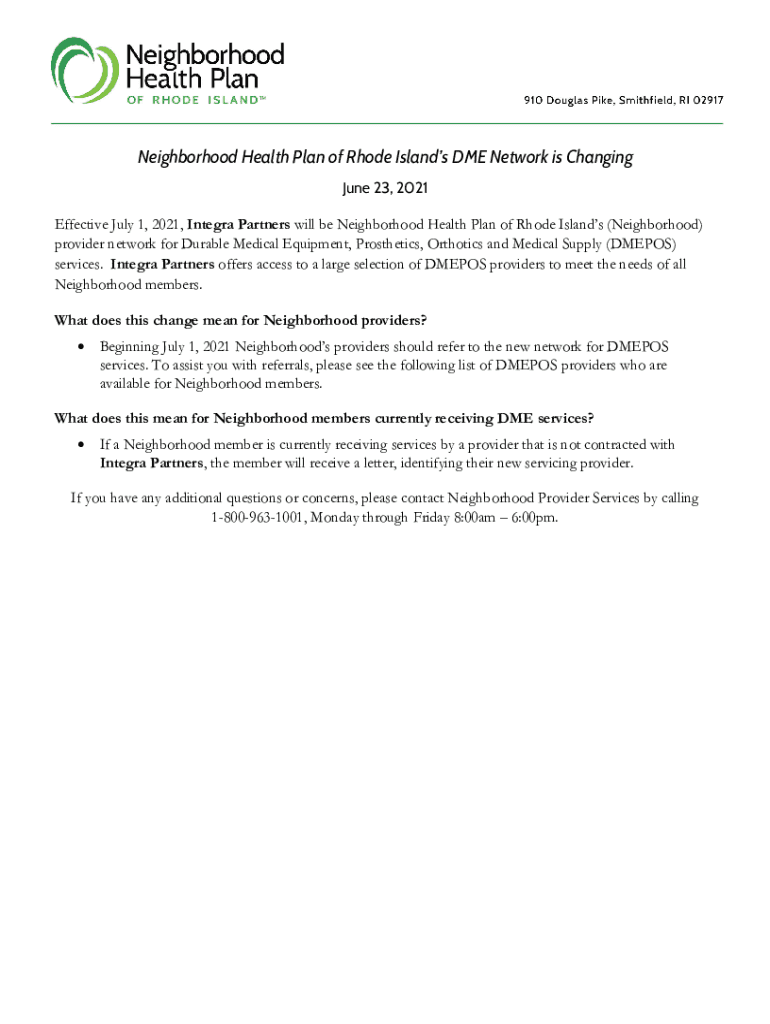 Neighborhood Health Plan of Rhode Islands DME Network is Changing June 23, 2021, Effective July 1, 2021, Integral Partners will be Neighborhood Health Plan of Rhode Islands (Neighborhood) provider