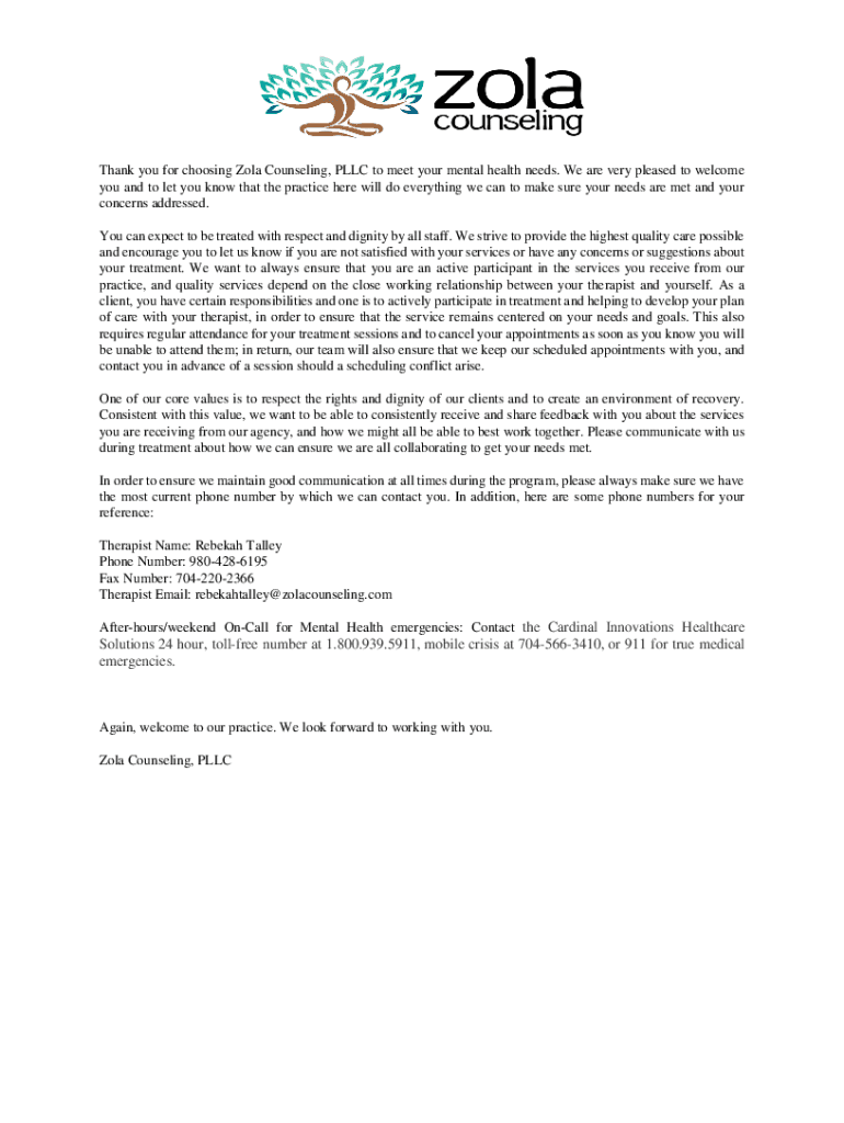 Thank you for choosing Zola Counseling, LLC to meet your mental health needs. We are very pleased to welcome you and to let you know that the practice here will do everything we can to make sure your