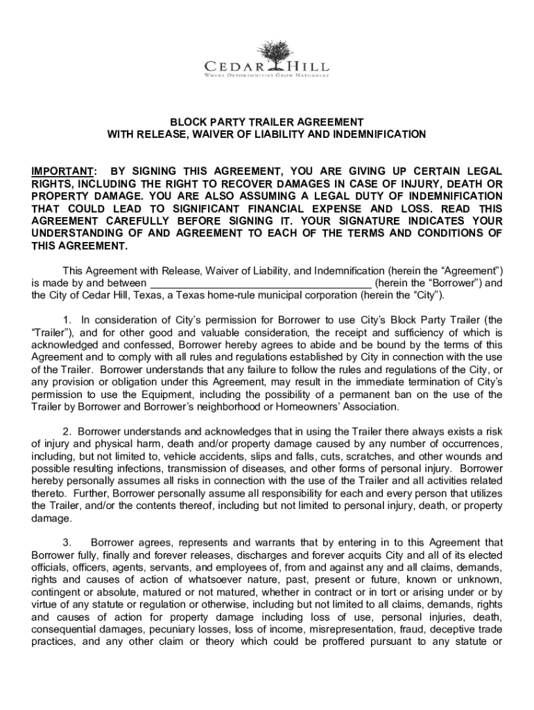 IT OF CEDAR HILLOCK PARTY TRAILER AGREEMENT WITH RELEASE, WAIVER OF LIABILITY AND INDEMNIFICATION IMPORTANT: BY SIGNING THIS AGREEMENT, YOU ARE GIVING UP CERTAIN LEGAL RIGHTS, INCLUDING THE RIGHT