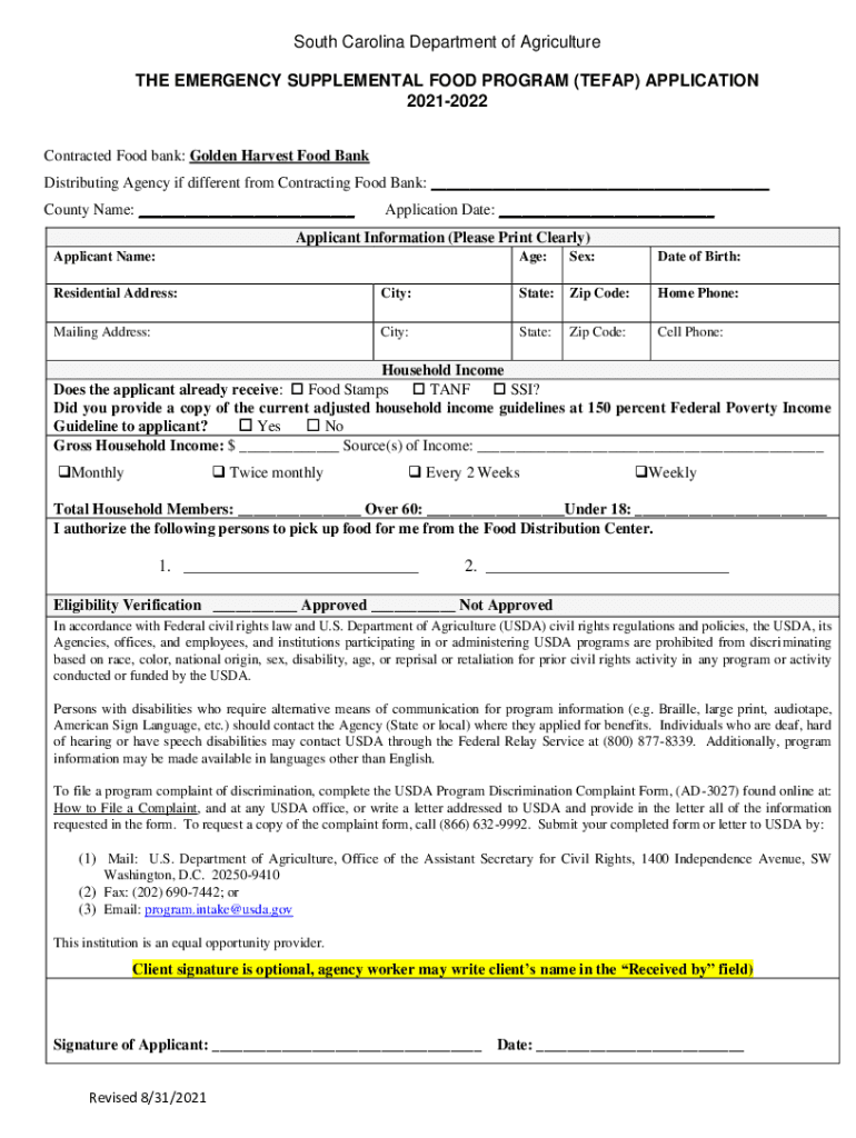 South Carolina Department of Agriculture THE EMERGENCY SUPPLEMENTAL FOOD PROGRAM (TEF AP) APPLICATION 20212022 Contracted Food bank: Golden Harvest Food Bank Distributing Agency if different from