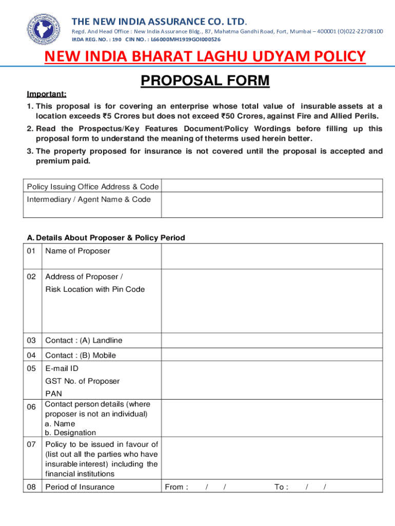 THE NEW INDIA ASSURANCE CO. LTD. Red. And Head Office : New India Assurance Bldg., 87, Mahatma Gandhi Road, Fort, Mumbai 400001 (O)02222708100 IRA REG. NO. 190 IN NO. L66000MH1919GOI000526NEW INDIA
