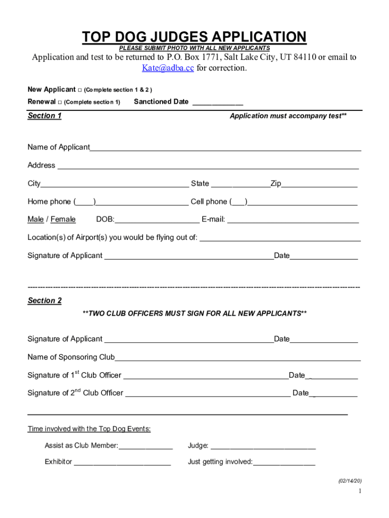 TOP DOG JUDGES APPLICATION PLEASE SUBMIT PHOTO WITH ALL NEW APPLICANTSApplication and test to be returned to P.O. Box 1771, Salt Lake City, UT 84110 or email to Kate@adba.cc for correction. New Applicant