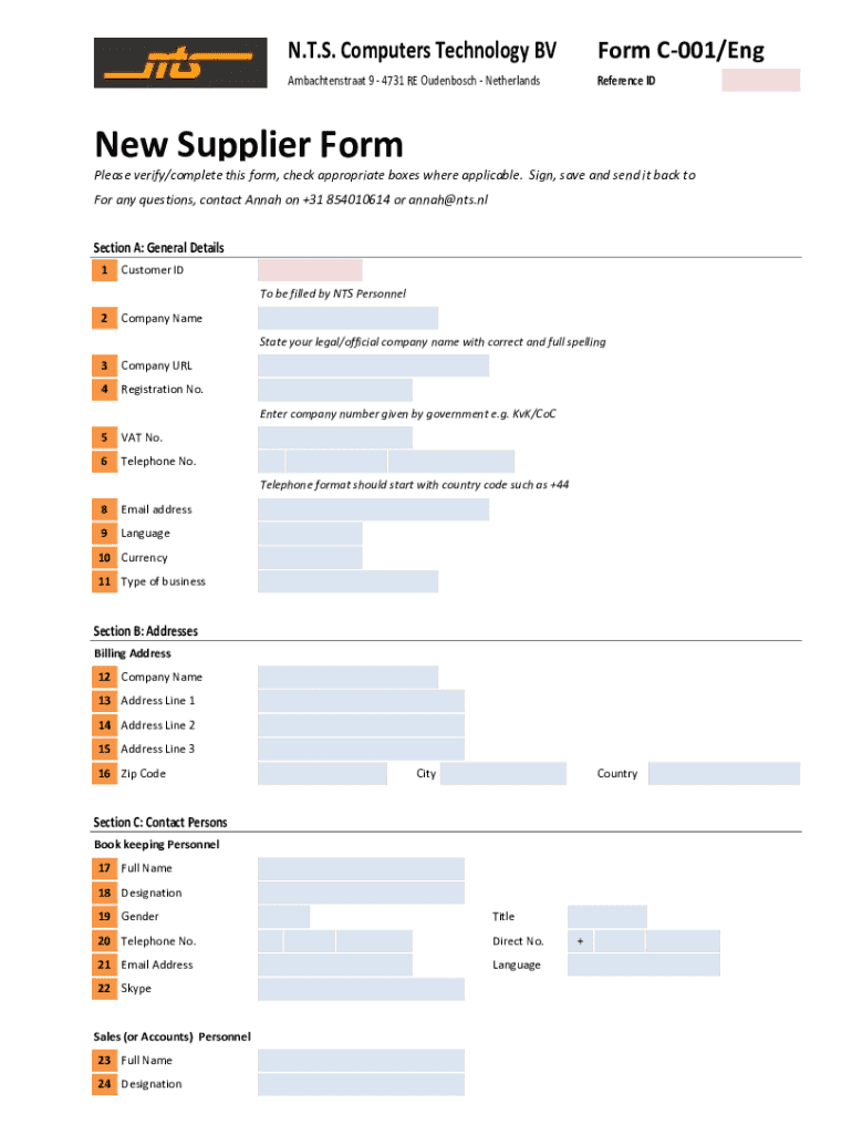 N.T.S. ComputersTechnologyBV FormC001/EngAmbachtenstraat9 4731REOudenbosch NetherlandsReferenceIDNewSupplierForm Please verify/completethisform, checkappropriateboxeswhereapplicable. Sign, saveandsenditbackto