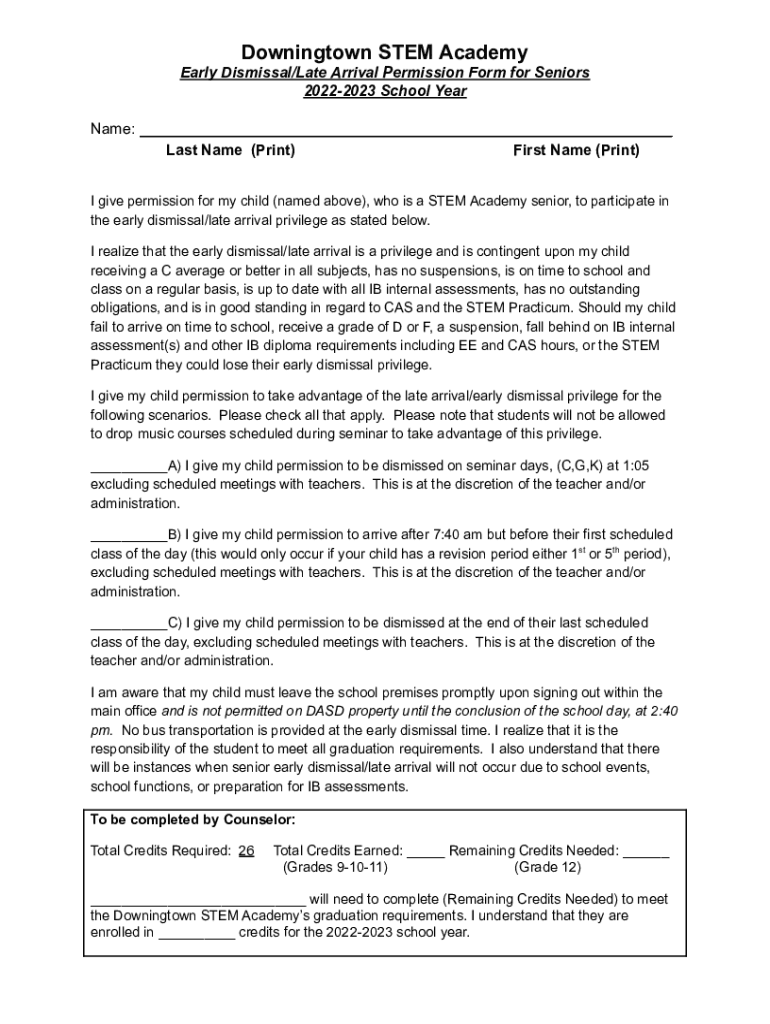 Downingtown STEM Academy Early Dismissal/Late Arrival Permission Form for Seniors 20222023 School Year Name: ___ Last Name (Print) First Name (Print) I give permission for my child (named above),