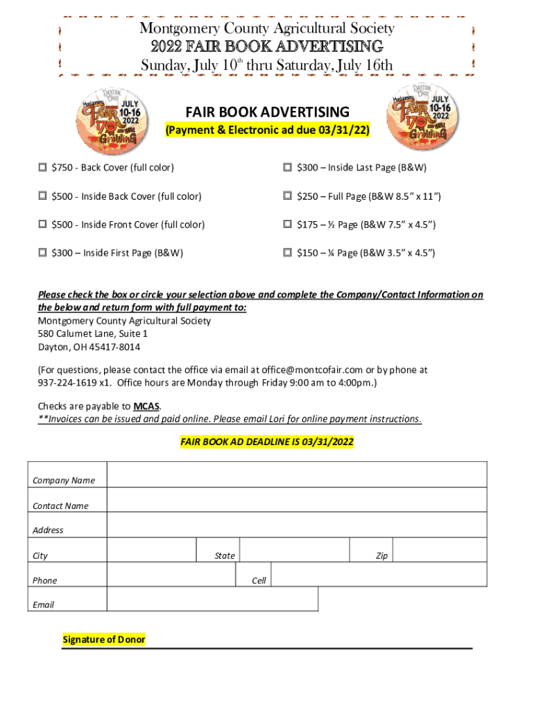 Montgomery County Agricultural Society 2022 FAIR BOOK ADVERTISING Sunday, July 10th through Saturday, July 16th FAIR BOOK ADVERTISING (Payment & Electronic ad due 03/31/22) $750 Back Cover (full color)