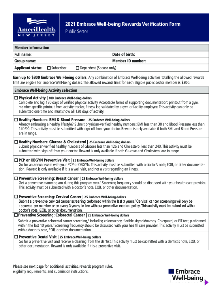 2021 Embrace Wellbeing Rewards Verification Form Public Sector Member information Full name:Date of birth:Group name:Member ID number:Applicant status:n Subscribers Dependent (Spouse only)Earn up