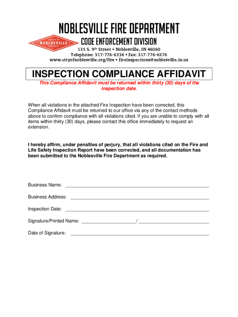 NOBLESVILLE FIRE DEPARTMENT CODE ENFORCEMENT DIVISION 135 S. 9th Street Noblesville, IN 46060 Telephone: 3177766336 Fax: 3177766376 www.cityofnoblesville.org/fire fireinspections@noblesville.in.usINSPECTION