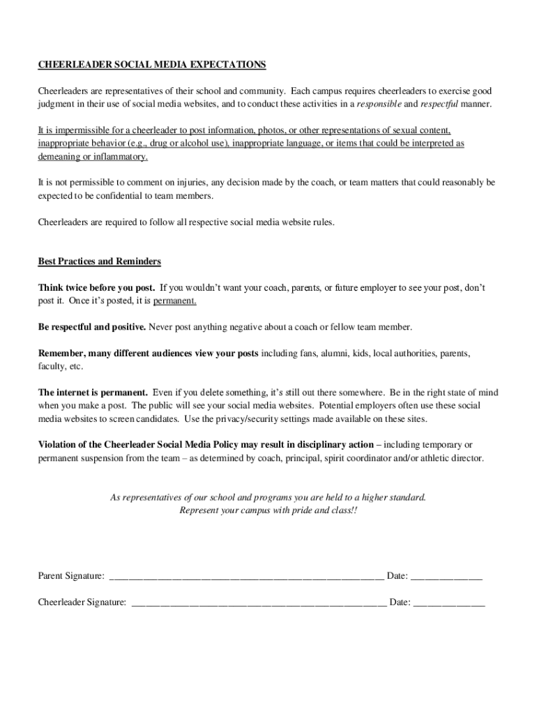 CHEERLEADER SOCIAL MEDIA EXPECTATIONS Cheerleaders are representatives of their school and community. Each campus requires cheerleaders to exercise good judgment in their use of social media websites,