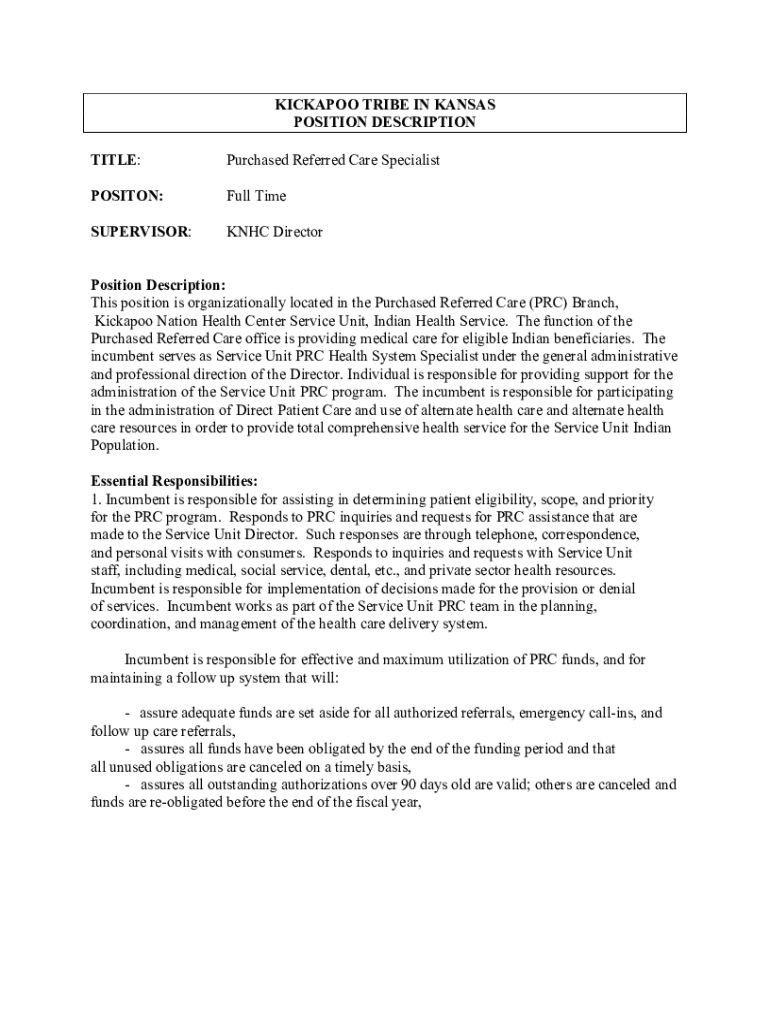 TITLE:Purchased Referred Care SpecialistPOSITON:Full TimeSUPERVISOR:NHC DirectorPosition Description: