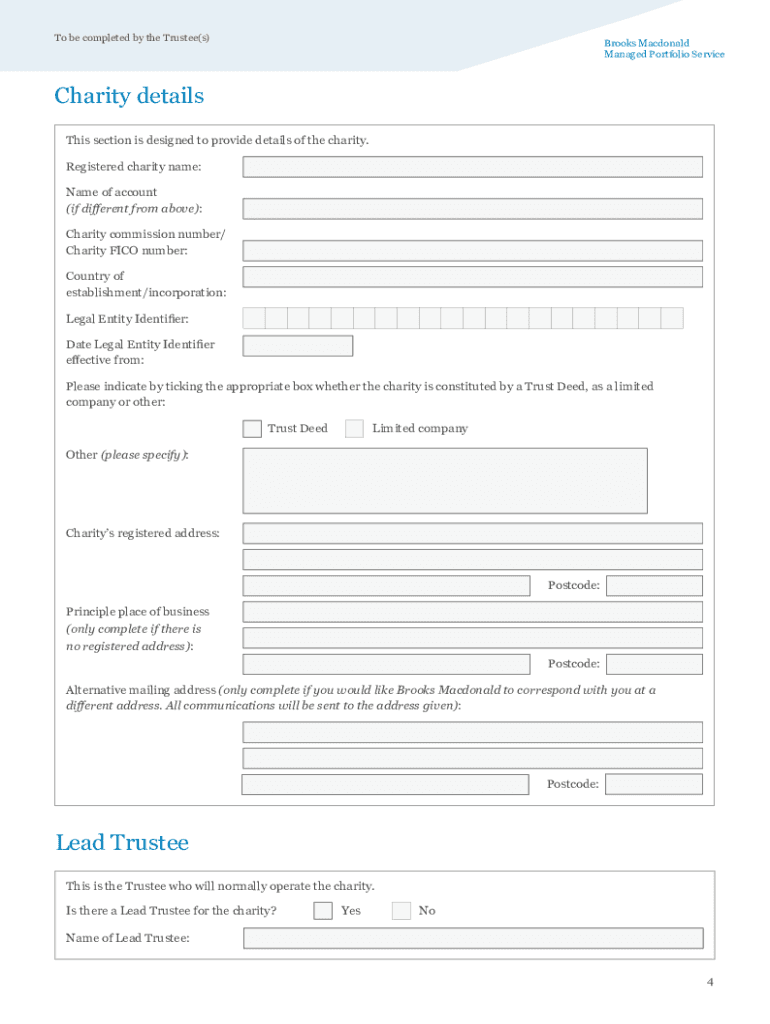 Managed Portfolio Service Application Pack for Charities Suitability Responsibility: Professional Adviser Brooks Macdonald Managed Portfolio ServiceNow Trustees Welcome to Brooks Macdonald Asset Management