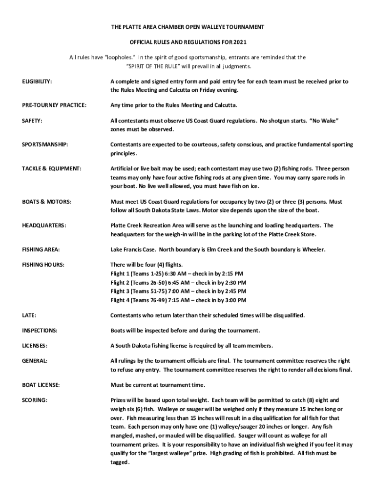 THE PLATTE AREA CHAMBER OPEN WALLEYE TOURNAMENT OFFICIAL RULES AND REGULATIONS FOR 2021 All rules have loopholes. In the spirit of good sportsmanship, entrants are reminded that the SPIRIT OF THE